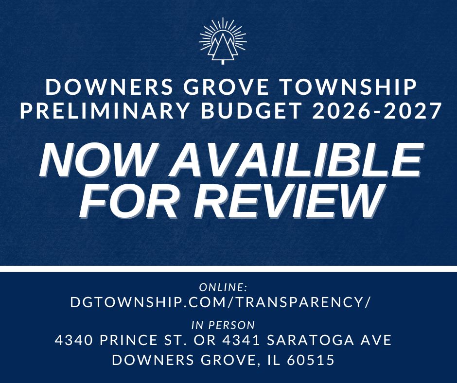 The Downers Grove Township Preliminary Budget for the 2026-2027 fiscal year is available for public viewing. The Public Hearings on said budgets will be held on Tuesday, February 17th at 7:00 pm and 7:15 pm, with the Regular Board Meeting immediately following. Documents can be found under Clerk/Transparency/Board Meetings.